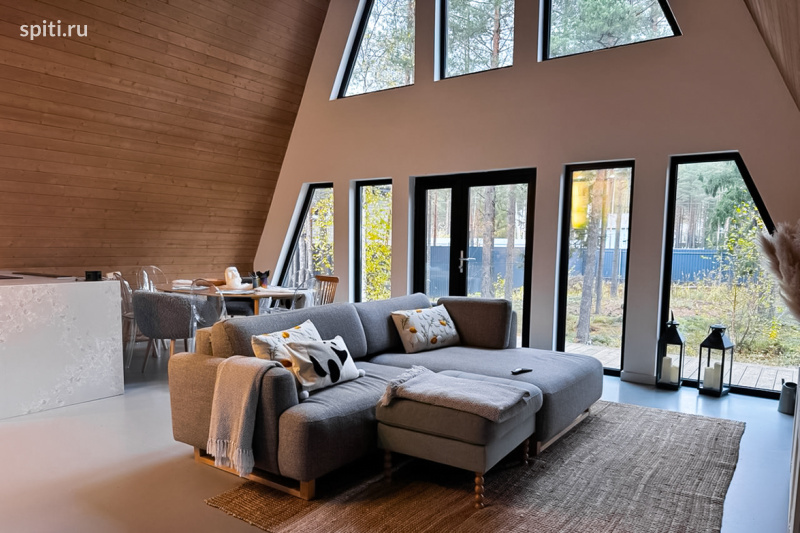 Сдается в посуточную аренду самый крупный A-frame коттедж в Ленинградской области. Архитектурный шедевр с геометричным силуэтом, где шестиметровые потолки, второй свет и панорамные окна создают эффект пространства и света. Дом расположен на опушке соснового леса, всего в 20 км от КАД — идеальный баланс уединения и доступности. - Просторная гостиная-кухня 56 м² с караоке и Smart-TV. - 4 отдельные спальни для комфортного размещения. - Расслабляющая сауна и японская ванна Офуро с видом на сосны. - Просторная терраса, мангал, костровая зона. Стильный интерьер, система «Умный дом», тёплые полы. Всё для душевных встреч, праздников и отдыха на природе. Цены: Будни: 20 000₽/сутки (2 суток — 30 000₽). Выходные: Пятница — 30 000₽, Суббота — 35 000₽, 2 суток (Пт-Сб) — 50 000₽. Сауна включена в стоимость. Возможно размещение с питомцами (по запросу).